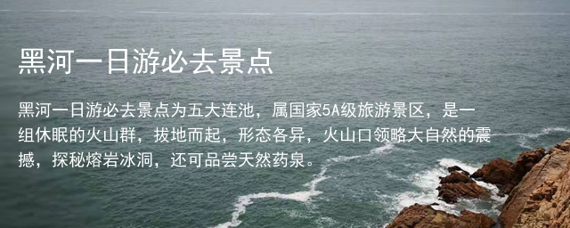 黑河一日游必去景点为五大连池,属国家5A级旅游景区,是一组休眠的火山群,拔地而起,形态各异,火山口领略大自然的震撼,探秘熔岩冰洞,还可品尝天然药泉。