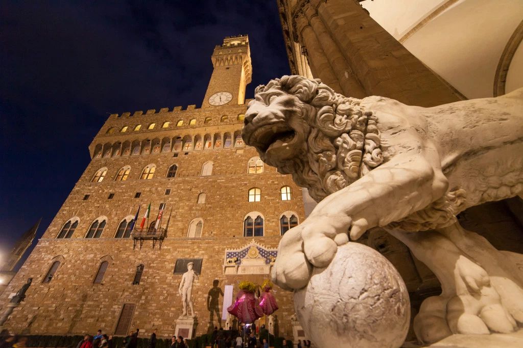 韦奇奥宫阿诺尔福塔(Torred’Arnolfo)高94米,是佛罗伦萨的重要地标之一,而500人议事大厅内最著名的是米开朗基罗的胜利女神雕像和瓦萨里创作的描绘科西莫一世带领佛罗伦萨军队击败比萨人和锡耶纳人的壁画。