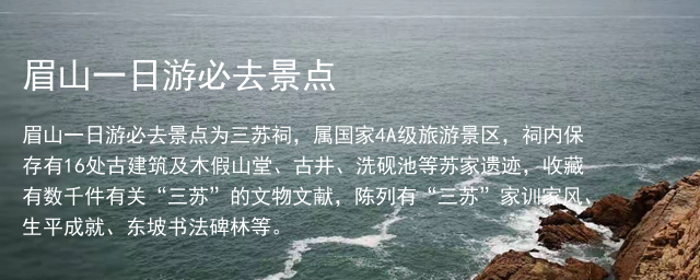眉山一日游必去景点为三苏祠,属国家4A级旅游景区,祠内保存有16处古建筑及木假山堂、古井、洗砚池等苏家遗迹,收藏有数千件有关“三苏”的文物文献,陈列有“三苏”家训家风、生平成就、东坡书法碑林等。