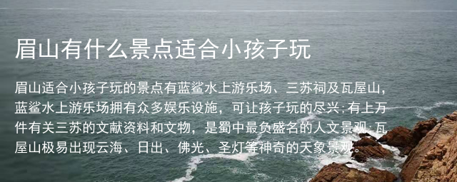 眉山适合小孩子玩的景点有蓝鲨水上游乐场、三苏祠及瓦屋山,蓝鲨水上游乐场拥有众多娱乐设施,可让孩子玩的尽兴;有上万件有关三苏的文献资料和文物,是蜀中最负盛名的人文景观;瓦屋山极易出现云海、日出、佛光、圣灯等神奇的天象景观。