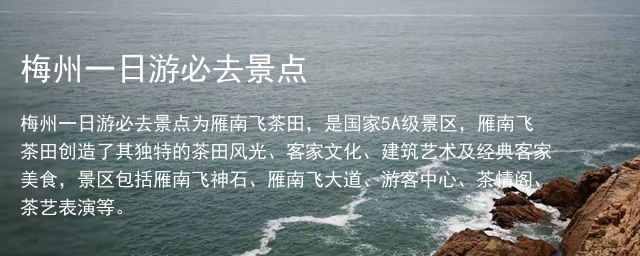 梅州一日游必去景点为雁南飞茶田,是国家5A级景区,雁南飞茶田创造了其独特的茶田风光、客家文化、建筑艺术及经典客家美食,景区包括雁南飞神石、雁南飞大道、游客中心、茶情阁、茶艺表演等。
