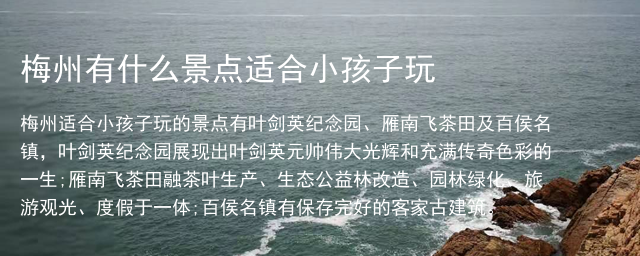 梅州适合小孩子玩的景点有叶剑英纪念园、雁南飞茶田及百侯名镇,叶剑英纪念园展现出叶剑英元帅伟大光辉和充满传奇色彩的一生;雁南飞茶田融茶叶生产、生态公益林改造、园林绿化、旅游观光、度假于一体;百侯名镇有保存完好的客家古建筑。