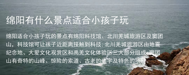 绵阳适合小孩子玩的景点有绵阳科技馆、北川羌城旅游区及窦团山,科技馆可让孩子近距离接触到科技;北川羌城旅游区由地震纪念地、大爱文化观赏区和禹羌文化体验区三大部分组成;窦团山有奇特的山峰、惊险的索道、古老的庙宇及特色的项目。