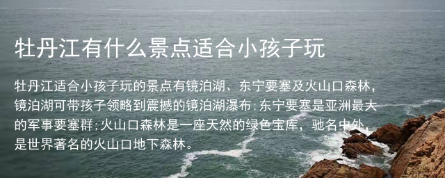 牡丹江适合小孩子玩的景点有镜泊湖、东宁要塞及火山口森林,镜泊湖可带孩子领略到震撼的镜泊湖瀑布;东宁要塞是亚洲最大的军事要塞群;火山口森林是一座天然的绿色宝库,驰名中外,是世界著名的火山口地下森林。