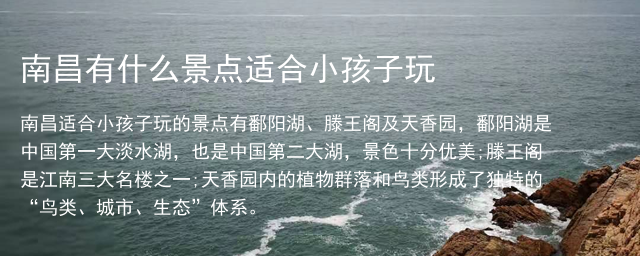 南昌适合小孩子玩的景点有鄱阳湖、滕王阁及天香园,鄱阳湖是中国第一大淡水湖,也是中国第二大湖,景色十分优美;滕王阁是江南三大名楼之一;天香园内的植物群落和鸟类形成了独特的“鸟类、城市、生态”体系。