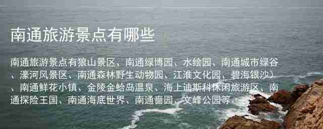 南通旅游景点有狼山景区、南通绿博园、水绘园、南通城市绿谷、濠河风景区、南通森林野生动物园、江淮文化园、碧海银沙)、南通鲜花小镇、金陵金蛤岛温泉、海上迪斯科休闲旅游区、南通探险王国、南通海底世界、南通啬园、文峰公园等。
