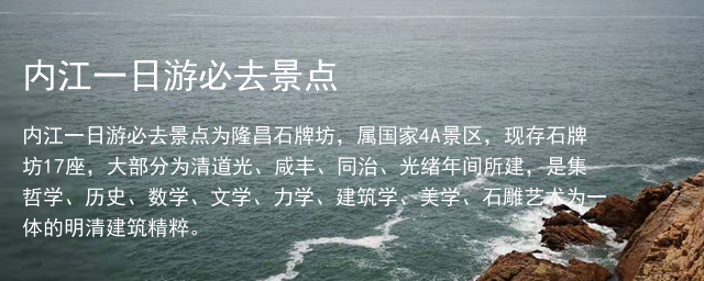 内江一日游必去景点为隆昌石牌坊,属国家4A景区,现存石牌坊17座,大部分为清道光、咸丰、同治、光绪年间所建,是集哲学、历史、数学、文学、力学、建筑学、美学、石雕艺术为一体的明清建筑精粹。
