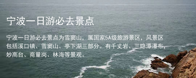 宁波一日游必去景点为雪窦山,属国家5A级旅游景区,风景区包括溪口镇、雪窦山、亭下湖三部分。有千丈岩、三隐潭瀑布,妙高台、商量岗、林海等景观。
