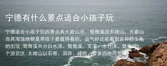 宁德适合小孩子玩的景点有大嵛山岛、鸳鸯溪及太姥山,大嵛山岛其海蚀地貌是带孩子最值得看的,运气好还能看到各种野生龟的出没;鸳鸯溪共分白水洋、鸳鸯溪、叉溪、水竹洋、鸳鸯湖5个游览区;太姥山以石奇、洞异、峰险、雾多四绝而名闻。