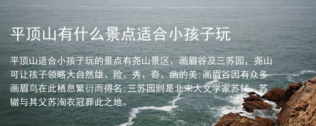 平顶山适合小孩子玩的景点有尧山景区、画眉谷及三苏园,尧山可让孩子领略大自然雄、险、秀、奇、幽的美;画眉谷因有众多画眉鸟在此栖息繁衍而得名;三苏园则是北宋大文学家苏轼、苏辙与其父苏洵衣冠葬此之地。