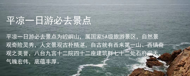 平凉一日游必去景点为崆峒山,属国家5A级旅游景区,自然景观奇险灵秀,人文景观古朴精湛,自古就有西来第一山、西镇奇观之美誉,八台九宫十二院四十二座建筑群七十二处石府洞天,气魄宏伟,底蕴丰厚。