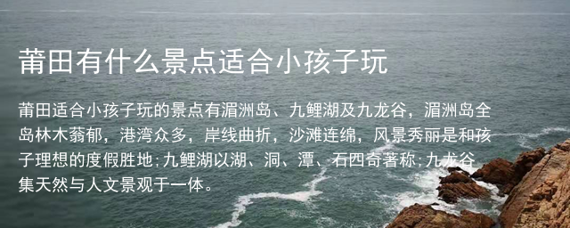 莆田适合小孩子玩的景点有湄洲岛、九鲤湖及九龙谷,湄洲岛全岛林木蓊郁,港湾众多,岸线曲折,沙滩连绵,风景秀丽是和孩子理想的度假胜地;九鲤湖以湖、洞、潭、石四奇著称;九龙谷集天然与人文景观于一体。