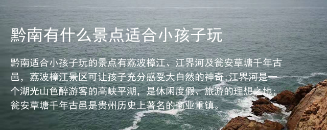 黔南适合小孩子玩的景点有荔波樟江、江界河及瓮安草塘千年古邑,荔波樟江景区可让孩子充分感受大自然的神奇;江界河是一个湖光山色醉游客的高峡平湖,是休闲度假、旅游的理想之地;瓮安草塘千年古邑是贵州历史上著名的商业重镇。