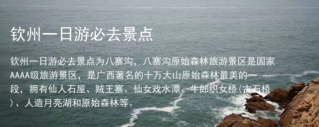 钦州一日游必去景点为八寨沟,八寨沟原始森林旅游景区是国家AAAA级旅游景区,是广西著名的十万大山原始森林最美的一段,拥有仙人石屋、贼王寨、仙女戏水潭、牛郎织女桥(古石桥)、人造月亮湖和原始森林等。