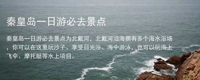 秦皇岛一日游必去景点为北戴河,北戴河沿海拥有多个海水浴场,你可以在这里玩沙子、享受日光浴、海中游泳,也可以玩海上飞伞、摩托艇等水上项目。