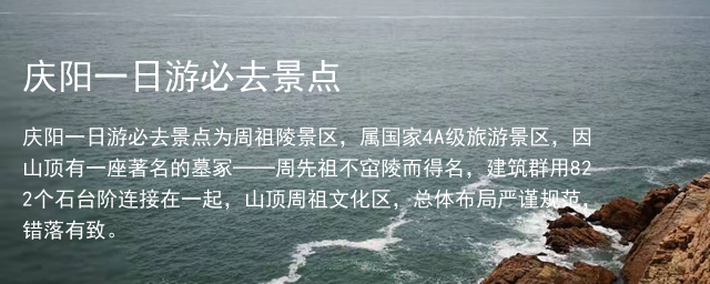 庆阳一日游必去景点为周祖陵景区,属国家4A级旅游景区,因山顶有一座著名的墓冢──周先祖不窋陵而得名,建筑群用822个石台阶连接在一起,山顶周祖文化区,总体布局严谨规范,错落有致。
