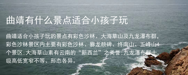 曲靖适合小孩子玩的景点有彩色沙林、大海草山及九龙瀑布群,彩色沙林景区内主要有彩色沙林、爨龙颜碑、终南山、五峰山4个景区;大海草山素有云南的“新西兰”之美誉;九龙瀑布群十级高低宽窄不等、形态各异。