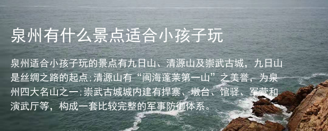 泉州适合小孩子玩的景点有九日山、清源山及崇武古城,九日山是丝绸之路的起点;清源山有“闽海蓬莱第一山”之美誉,为泉州四大名山之一;崇武古城城内建有捍寨、墩台、馆驿、军营和演武厅等,构成一套比较完整的军事防御体系。