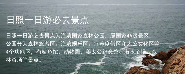 日照一日游必去景点为海滨国家森林公园,属国家4A级景区,公园分为森林旅游区、海滨娱乐区、疗养度假区和太公文化区等4个功能区,有鲨鱼馆、动物园、姜太公纪念馆、海水浴场、森林浴场等景点。