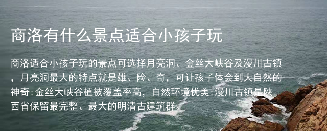 商洛适合小孩子玩的景点可选择月亮洞、金丝大峡谷及漫川古镇,月亮洞最大的特点就是雄、险、奇,可让孩子体会到大自然的神奇;金丝大峡谷植被覆盖率高,自然环境优美;漫川古镇是陕西省保留最完整、最大的明清古建筑群。