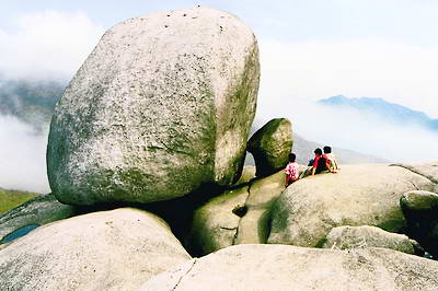 奇山异石,令我们目不暇接。古母石,悬空而立山顶,摇摇欲坠,恭候着每一位游人登顶,饱览无限风光。石本平常,但一个神奇的民间传说,让它阅尽了尘世沧桑,经受了风雷雨电的磨眠,雕塑成梁野山的魂与魄。只要目睹傲立临风的古母石,就会脱口而出“这就是梁野山”。
