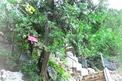 山坡上纽纹古柏(俗称拧劲柏)苍翠劲拔,躯干纽缠,条条粗纹根扎于坚硬的岩缝之中,郁郁葱葱,山花遍野,鸟鸣山谷,泉水叮咚,真乃是郊区度假、休闲之仙境!