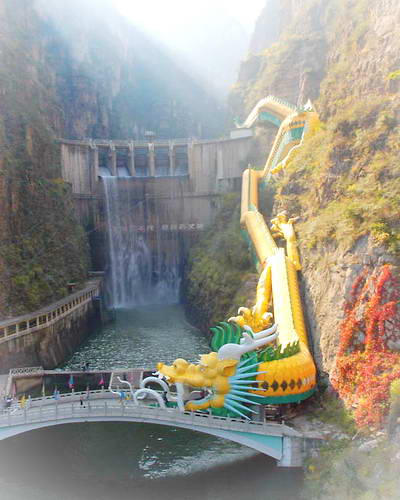 乘坐缆车,我欲因之梦神仙,瞬间即到玉皇顶;穿越三百米长的百花仙洞,就穿越了神州大地的南疆北国,四季风光;之后,乘上横跨谷口的福斯特比翼滑道,如同乘上美丽的彩虹,于风,于幻,于有惊无险之中,从龙庆峡谷的仙境,回到现实。