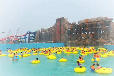园区正北是世界上面积最大的海浪、海啸池,达到2万平方米,分为左右两个造浪区,最高可产生3米的巨浪、可连续造浪15分钟,能够产生13种波形。海啸池中央是500平方米的大型表演舞台,可进行各种演出和活动。海啸池中的小岛,郁郁葱葱布满热带植物,营造了最佳的海岛效果。