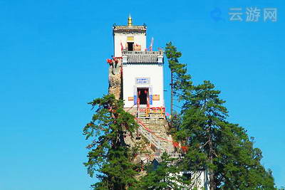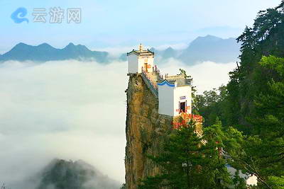 登塔云观奇景,绝妙处在金顶。金顶就是观音殿。这座不足六平方米的小庙,建筑十分险厄。它居于塔云山顶,三面悬于万丈深渊,是用四根石柱插入石缝,用石条铺垫立基,庙顶用黄铜铸尖。旅游攻略http://www.yuANyoukE.cOM
