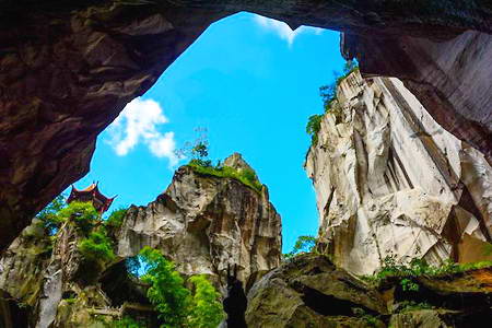 水云硐位于双门硐景区西侧,系经千百年开矿采石后留下的洞群景观,由52个洞体组成,其中透天洞6个,水洞8个,总面积约1.5万平方米,气势磅礴。