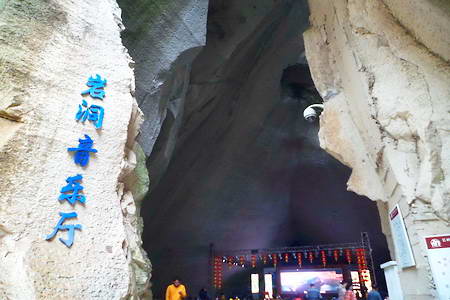 观夕硐位于双门洞景区凤凰山北麓,是千年开采留下的最大洞群,有348个洞体,洞内面积为5.38万平方米。河中有小舟,小舟可用手划桨,也可用足踩桨。弃舟向左而行,豁然开朗,便是国内绝无仅有的岩洞音乐厅了,岩洞音乐厅总面积为2000平方米,能同时容纳近700人入座欣赏音乐厅民乐队的精彩演奏。