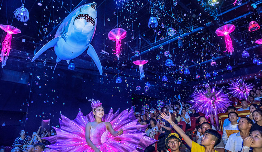 《张家界千古情》演出运用先进的声光电等高科技手段,呈现出上天入地、出其不意的效果,让观众时刻沉浸在演出中,身临其境地欣赏大自然的鬼斧神工、海底世界的缤纷多彩、如梦似幻的武陵仙境、3000吨大洪水瞬间倾泻而下的神奇壮观。